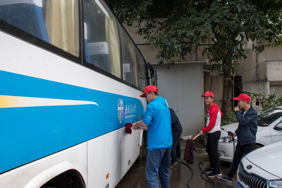 10月21日下午,志愿者们热情投入,分别对两辆校车进行了清洗,他们累了就拿起高压水枪滋一滋,看着美丽的泡沫,像一簇火花,清凉的水珠肆意飞溅,没有了对作业的压力,有的只是享受这次活动,以及对第二次见面的九里多出的一份喜爱,喜欢它的地理位置,喜欢周围的美食,以及对0号教学楼的感叹,几个小时的短暂洗车之行,让他们对这个校区又多了一分了解,更积累了志愿学习的经历。