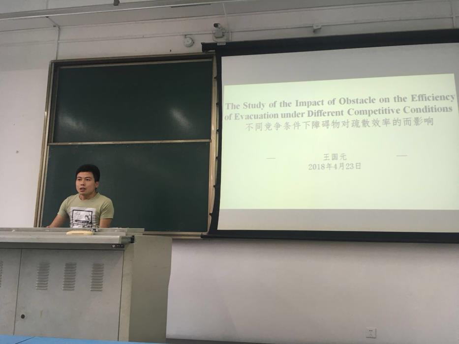 (2)能见度对个体及小群体疏散速度及路径选择的影响研究,主讲人2016级硕士谢玮。