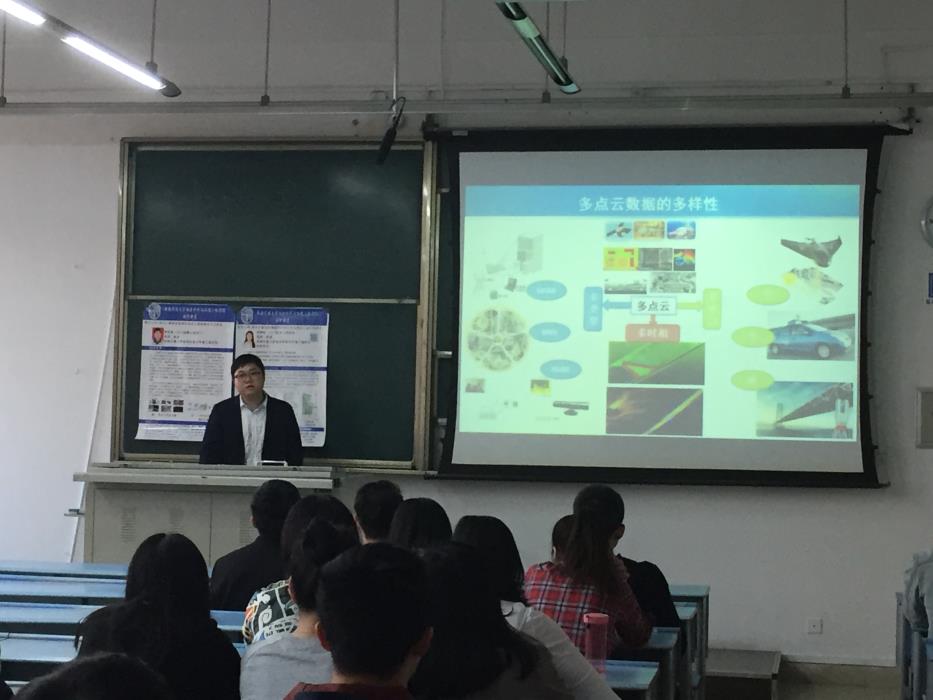 在X2424教室中,由2017级博士研究生朱庆和2016级硕士研究生于昊加进行汇报。朱庆博士给大家介绍了“面向三维城市建模的多点云数据融合方法探索”的研究进程,昊加同学则为我们讲述了“基于OSG的倾斜摄影实景三角网模型交互式编辑软件研发”