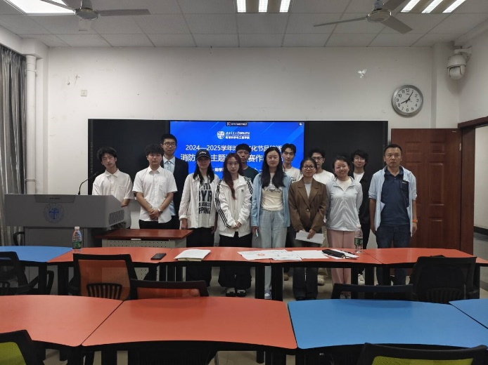 最后,答辩队伍成员与两位老师进行合影留念。至此,2025年消防安全主题设计大赛答辩会圆满结束!