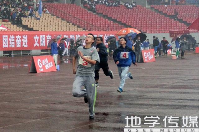 首先是男子100米的比赛。一声枪响,运动健儿们健步如飞。领先者还在努力向前冲以拉开距离,而落后者也在努力追赶。他们体现出了自强不息的体育运动精神:奋勇争先,超越自我。一步步的跨越,是对向上的生命最真实的诠释,汗水和雨相伴,早已分不清彼此。而他们,昂扬向上,跨向终点。紧接着进行的是女生100米的比赛。雨中的她们,并没有显得那样娇弱。巾帼不让须眉,上场不输男生。女生中不乏运动健将,她们总是能脱颖而出,并且毫不逊色于男生。