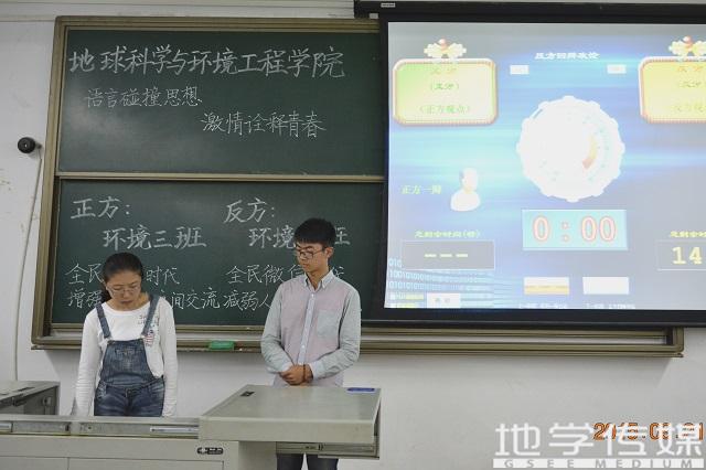 本次比赛采用软件计时,正方一辩在阐述陈词是说到:“微信是人与人之间交流的工具,使人们交流更加方便、快捷。”她语速较慢,吐词清晰。反方一辩先提出了交流的定义,强调交流是进行感情交换的过程,进而说明微信不仅不适用于交流,反而加剧了人与人之间的冷漠。在之后的申论环节中,反方一辩以一段材料说明面对面交流的真实性,以逢年过节青少年只顾用微信聊天而忽略与亲人面对面的交流的现象为例,反驳正方观点,增强了论证力度。这时,正方二辩质问反方二辩:“与远方的亲人用微信聊天难道不能增进与亲人之间的情感吗?”反方二辩立即回击:“如果微信能增加与亲人之间的情感,那么为什么还会有这么多人拼破头皮抢春运车票?”此时赛事升温,到了双方都当仁不让的状态。之后到了最激烈的自由辩论时间,正方坚持微信是拓宽人们交流的一种工具,反方却咬定交流要体现情感的流露。在正反双方总结完之后,整场辩论赛就到此结束了。随后的是正反双方观众的提问时间。王濛学长对本次比赛做了精彩的点评,他表示这是的确一次精彩的辩论,但双方都没有说服对方,反方辩论出现较多的漏洞,他希望两队能在接下来的表现更好。最后,主持人宣布本次辩论的优秀辩手是正方四辩,地质一班以3:2胜环境五班。