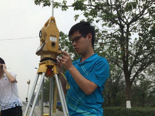 4月13日下午3时许,尽管天气异常炎热,参赛选手们却十分珍惜赛前的练手机会。犀浦校区四号教学楼背后的主干道上,随处可见正在熟悉场地以及练习仪器操作的选手。虽然测量技能大赛还未正式开始,空气之中已经弥漫着“硝烟”的味道。校道两旁,有的团队正在讨论分工合作,比如如何保持对中整平的稳定性,借此提高测量效率;有的团队为了提高熟练度,正在比赛场地进行实地测量。这足以见得,参赛选手们都十分重视此次比赛。