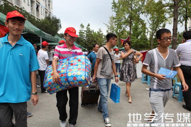 10:00左右,地学迎新点迎来了一个小高峰,但现场工作依然能够保持井然有序。正在登记注册的新生,在学长学姐的引导下顺利完成登记注册,缴费等一系列繁琐的工作,而在后面排队的同学则可以在休息区进行休息,负责迎新的同学还非常人性化的为新同学及其家长送上纯净水解渴。