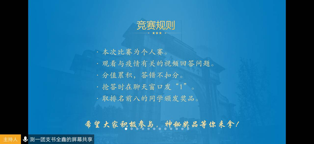 本次线上知识竞赛活动在腾讯会议开展,每观看完一段疫情相关视频,同学们都将根据共享屏幕上出现的题目进行抢答,并获得相应积分。