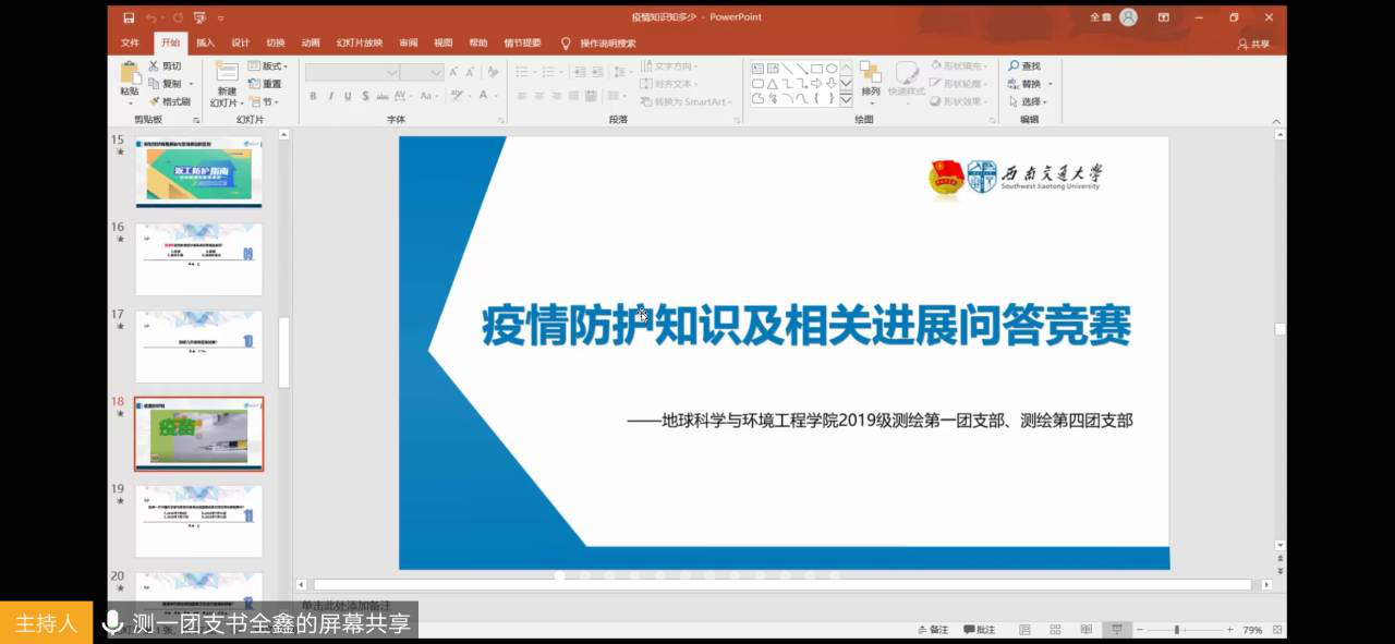 本次活动由测绘一班团支书全鑫进行相关资料查找、出题以及ppt制作,测绘四班团支书余君负责线上活动的主持。