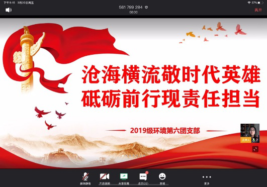 为了鼓励支部团员青年积极了解当前疫情形势,宣传防疫知识,科学参与防疫工作,加强自身学习、全面发展,并在学习和实践中增进对党和国家制度优越性的认识和热爱,树立自身坚定信念与远大理想,2019级环境第六团支部于2020年3月20日晚上9点在腾讯会议举办了以“战疫中最美的青春——团员青年的责任与担当”为主题的线上团日活动。活动形式为观看疫情相关思政课节选视频并展开讨论。环境第六团支部的全体成员参加了此次活动。