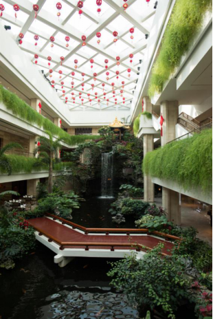 置于中堂的“故乡水”,以壁山、瀑布、小桥为元素,创造了一幅独具岭南风情的画卷,改革开放之初,白天鹅酒店接待的人员除了外宾,大多数是归国探亲访友的侨民,以“故乡水”赠游子,体现了当时的设计风格和时代背景。