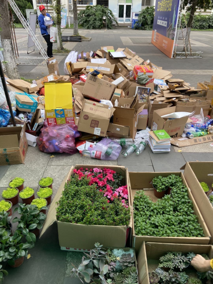 下午4:30左右,志愿者开始对活动场地内的废品进行整理,待收废品的师傅就位后便有条不紊地将废品运送上车。在此之后,志愿者们又对场地上散乱零碎的垃圾进行清理,以及对桌椅、鲜花等进行整理,为期两天的废品换鲜花活动圆满结束!