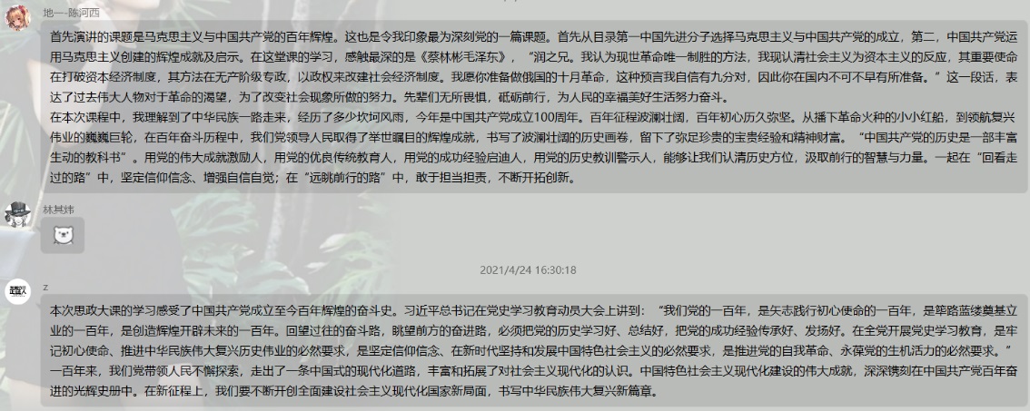 课后,部分同学在团支部群里面发表了本次思政大课学习的思想感悟。
