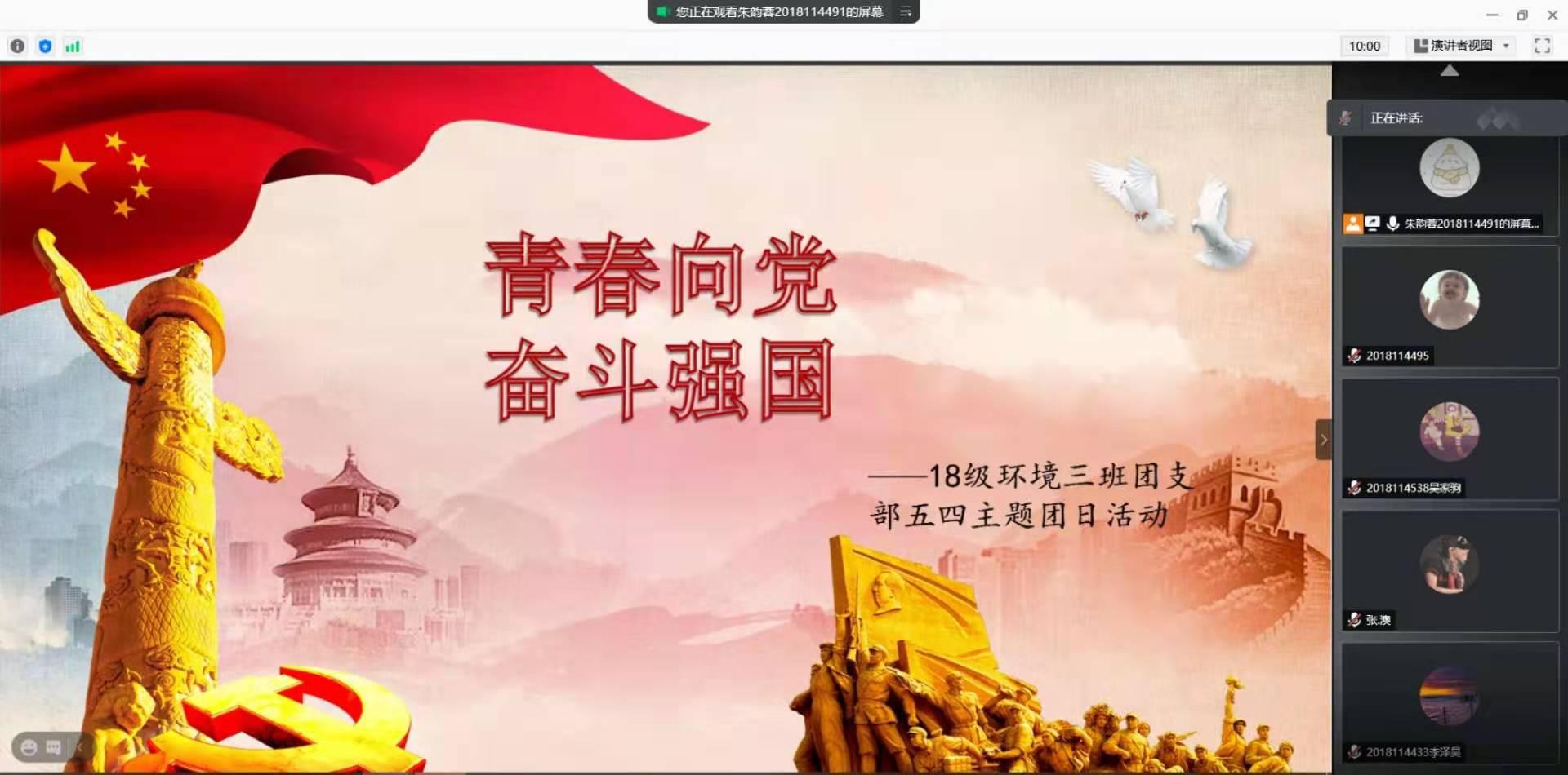 为响应院团委引导广大团员青年了解党的光辉历史、感悟党的初心使命、领会党的创新理论、体会党的精神谱系、传承党的红色基因的号召,2021年4月29日周四晚上七点半,bevictor伟德官网2018级环境第三团支部于腾讯会议开展“青春向党,奋斗强国”线上主题团日活动,共有21人参加此次团日活动,活动由团支书朱韵蓉主持。