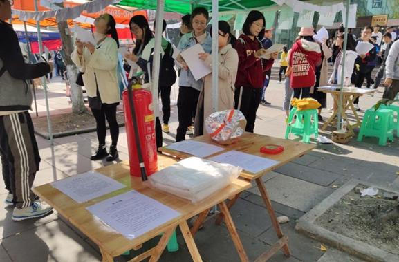 活动当日,志愿者们早早到达各自的岗位上,开始了布置活动场地的工作,为一天的活动做好充足的准备。中午,正是活动高峰期,志愿者们分工明确,各自坚守着自己的岗位,宣传、引导、介绍器材、发放奖品、奖品登记,每一个工作都做得细致到位。同时我们还向消防科老师搬来了“镇场子的宝贝”——二氧化碳灭火器,防毒面具和消防毯。在答题的同时,还能顺便了解消防器材的使用方法,一举两得。这次活动线上线下参与人数达到360人,帮助同学们了解到相应的消防知识,也达到了此次活动普及消防知识,提高员工的安全意识和自救能力,推进实现安全校园、和谐校园的目的。