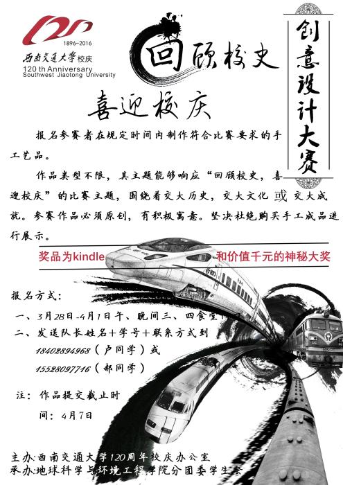 百廿载杲杲唐院垂宪中华育桃李,双甲子煌煌上庠薪火相传遍五洲。交大是千千万万交大人的家,是孕育许许多多祖国栋梁的摇篮,更是为实现中国梦做出重大贡献的地方。无论是辉煌的唐山时代,还是华丽的峨眉时代,抑或是现在两地三校区共同发展的时代,我们的交大都创造出不可磨灭的辉煌。这些辉煌将由我们去铭记,去传承。所以已经成功举办过多次“低碳环保创新生活”大赛的地bevictor伟德官网即将举办一场“回顾校史,喜迎校庆”创意设计大赛。去铭记该属于我们的辉煌,去传承该属于我们的交大精神。作为交大人的我们,赶快行动起来,用手工作品的方式来展现你对交大的热爱吧。