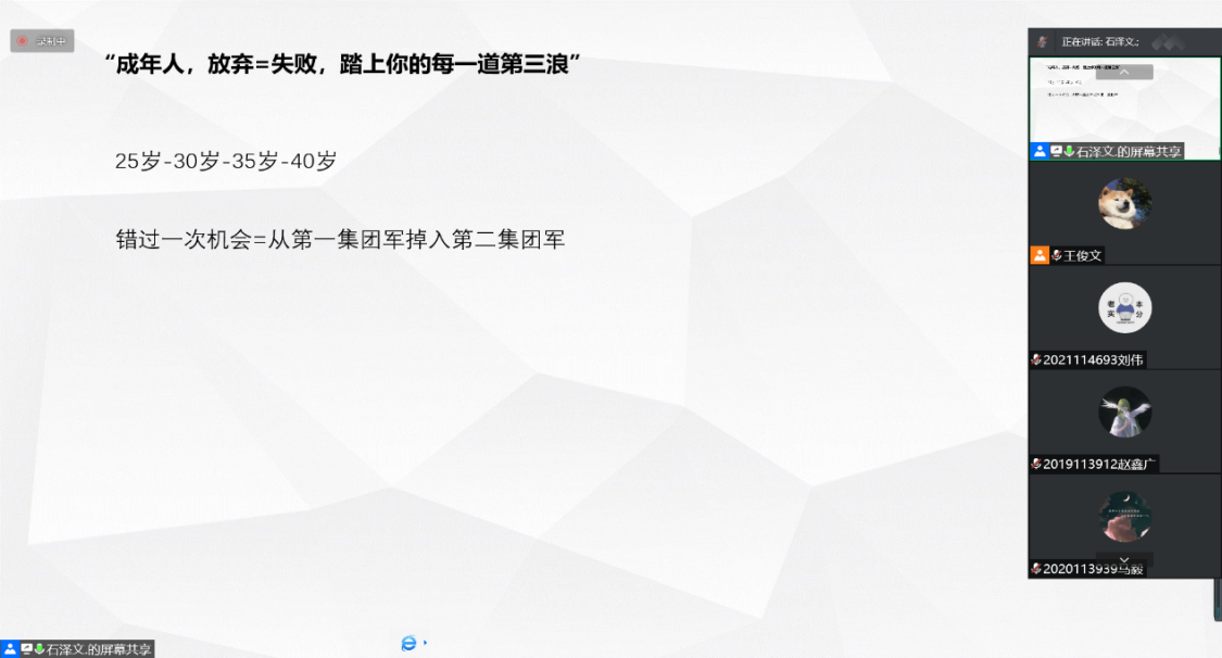 2021年12月5日晚7点半,bevictor伟德官网邀请公司优秀毕业生开展“生涯番茄”系列线上沙龙第三季第五期,本次活动通过线上平台“腾讯会议”进行,主讲人为公司2017级遥感科学与技术优秀毕业生,现就职于华为有限公司的石泽文学长,学长作为党员,争做先锋模范作用,开展本次主题为“乘浪”的活动。