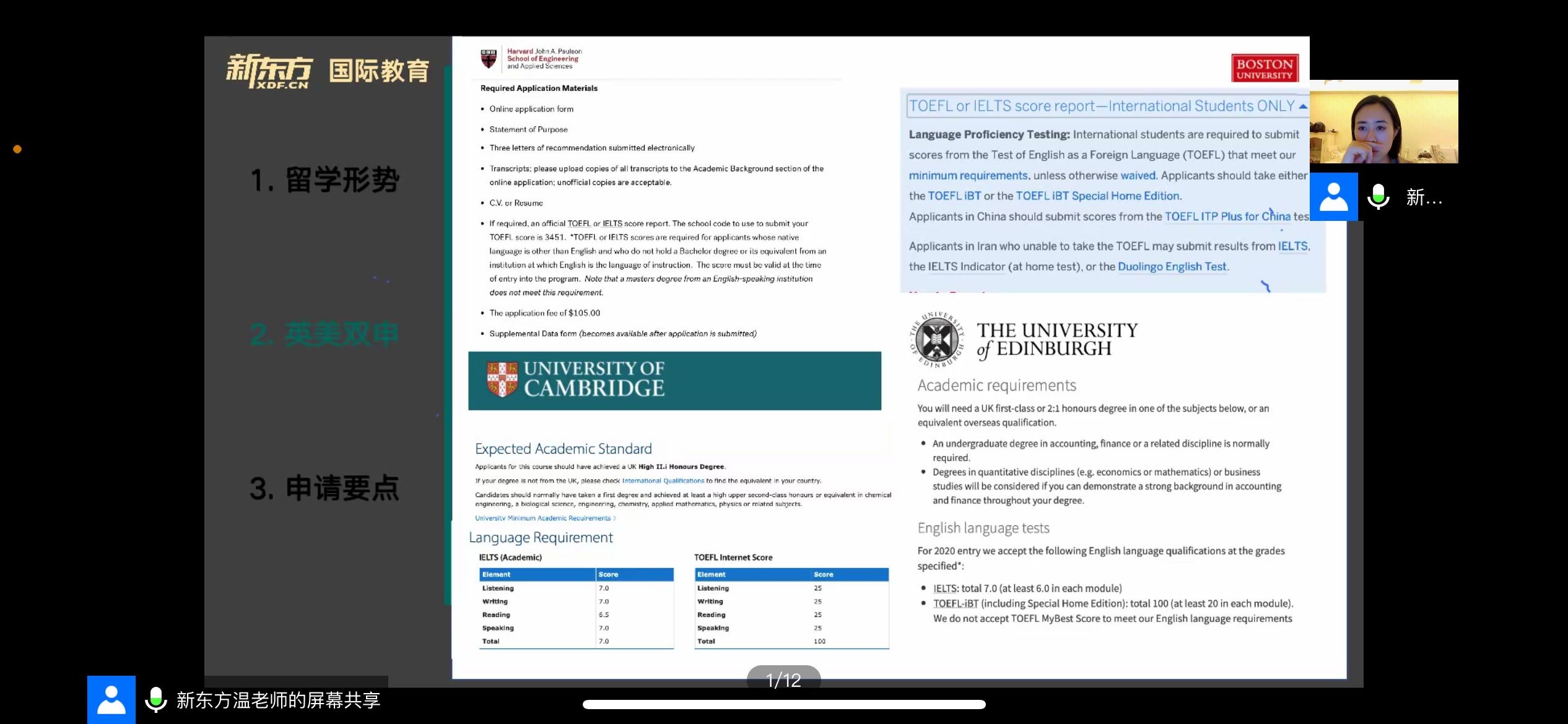 而后,温潇卓老师向我们分析了在疫情影响下出国留学的情况与局势,通过分享自己大学的经历,让我们对现如今的留学差异进行反思,同时还向我们介绍了雅思和托福考试的要求与步骤。