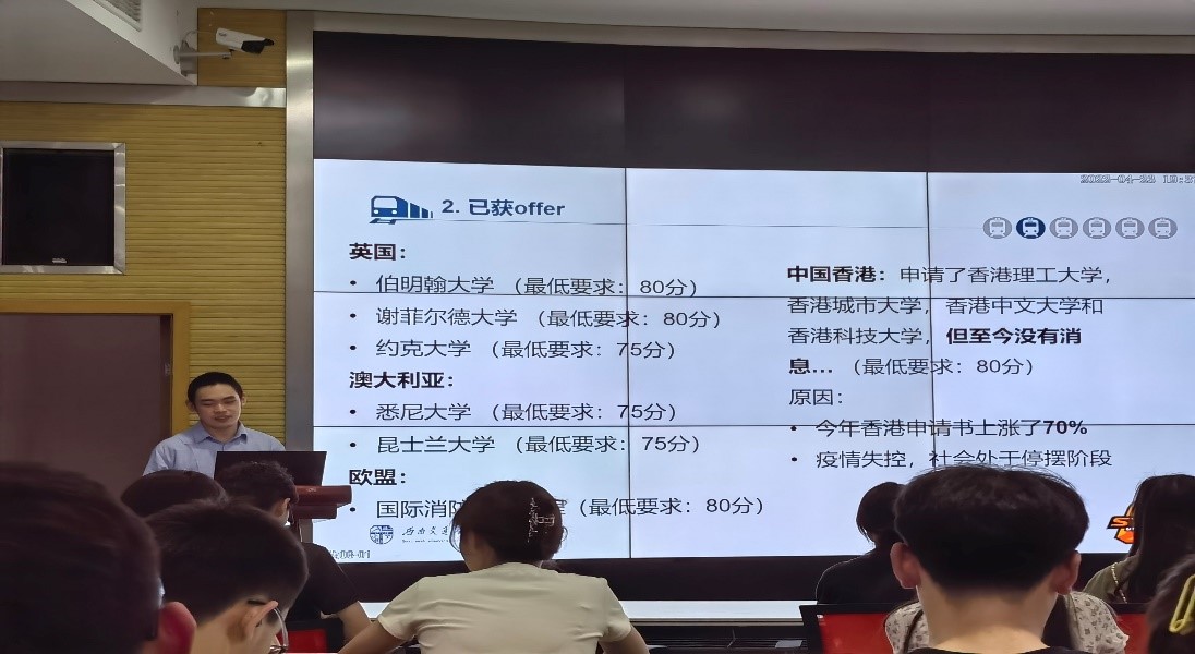 首先,萧琨铧介绍了自己所获的offer,并以此进行了院校介绍,介绍了各个公司的优势以及强势专业,通过分析这些公司,自己的考虑,说出自己的最终选择:国际消防安全工程硕士,并分析了IMFSE的授课结构,优点以及其缺点。