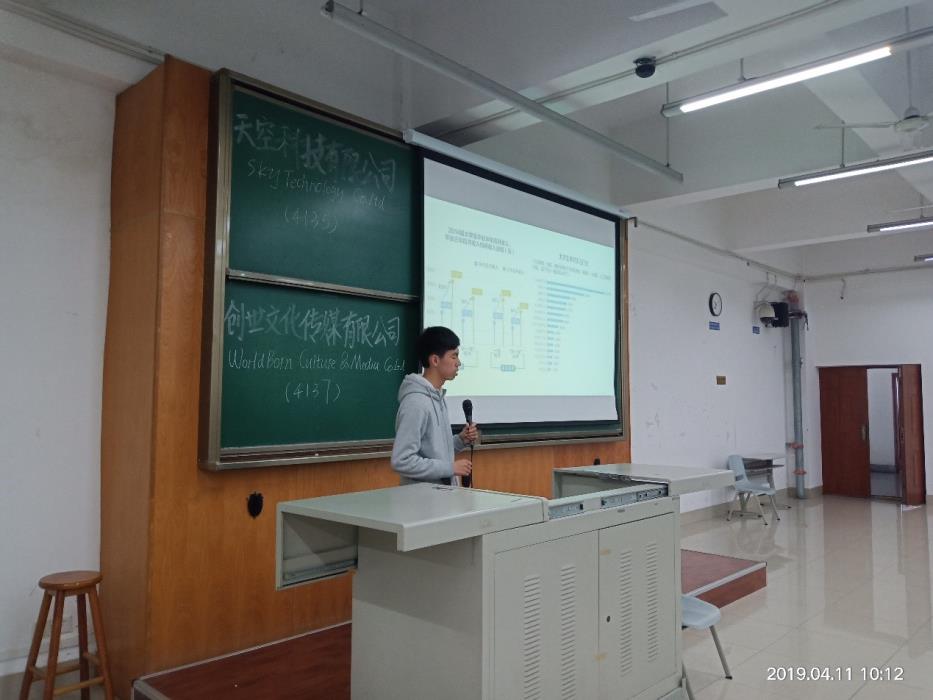 4月11日上午9:35,大家均上完第一讲课,带着自己提前准备好的简历来到4350,原本宽阔地教室因为同学们地到来竟呈现出拥挤之象。将近10:00,同学们大约都已来齐。我测绘辅导员杨都强老师也已到场,测绘一班团支部书记林其炜将制作好的powerpoint展示在多媒体屏幕上,一侧的黑板上写着“天空科技有限公司 4135”,下方写着“创世文化传媒有限公司 4137”,分别告知同学们自己面试的地点。另一边,测绘二班、三班、四班团支部书记,何欢、张昊雪、刘海蝶均对各本班参与本次活动的同学做具体介绍和面试规则。