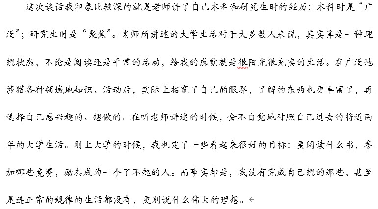 第一阶段,杨老师强调了生涯探索的必要性并以自己为例,阐述了“自我的可能性”与“社会再认知”两个方面。首先,杨老师提到,从个人发展角度看,我们需要“拓宽”和“聚焦”。这两个词语看似矛盾其实是交错并行的,即拓宽到一定广度才能聚焦,聚焦之后要结合拓宽。其次,杨老师和大家分享了自己本科和研究生的经历,帮助大家全面地认识自己,激发大家的思考。