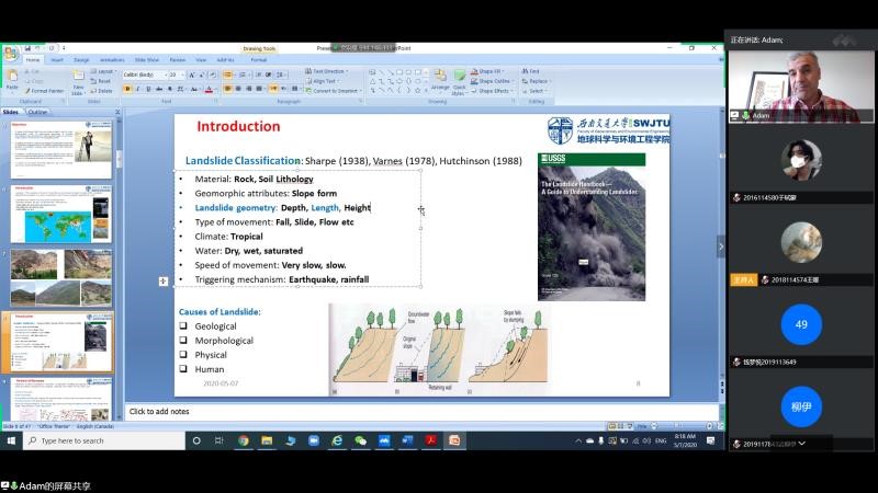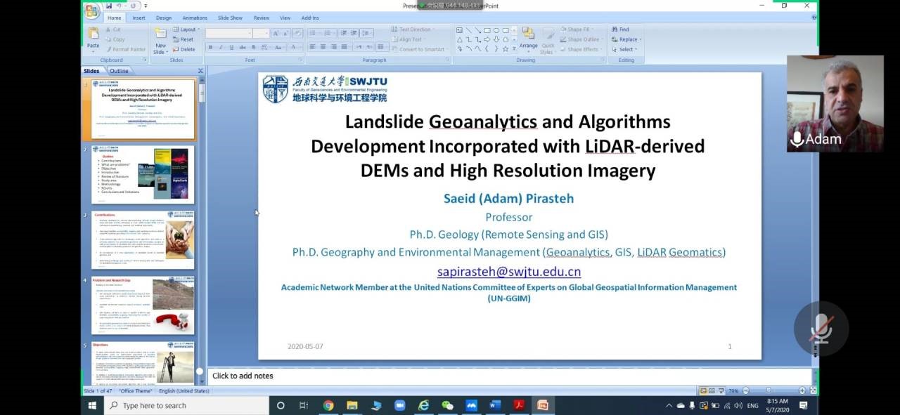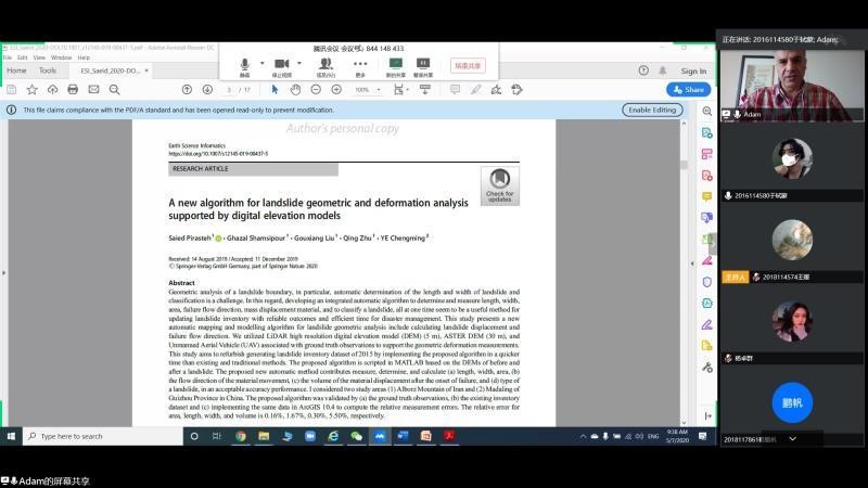 2020年5月7日晚20:00,bevictor伟德官网邀请公司外籍教师开展“国际化+名师讲堂”国际视野与出国留学系列第三期讲座,本次讲座通过线上平台“腾讯会议”进行,主讲人为Saeid(Adam) Pirasteh教授,讲座由杨都强老师主持,讲座主题为Research Colloquium in Geospatial Information Management for Disaster Management: Landslide(地理空间信息管理促进灾害管理研究讨论会:滑坡)。