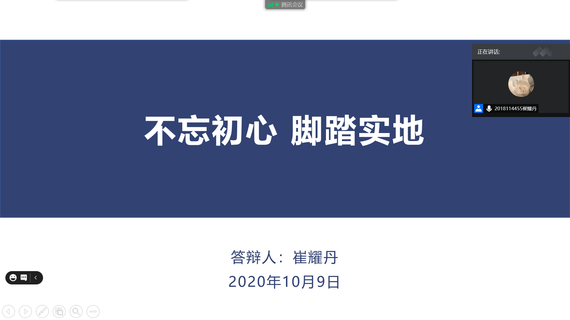 首先第一位答辩者,来自环境2018-01班的崔耀丹同学,她以“不忘初心 脚踏实地”为此次答辩的主题,结合其自身思想基础、学习科创、员工工作、实践活动及文体活动等优势,充分展现出良好的员工风貌和思想觉悟。崔同学在答辩中提到“我们要向习近平主席所说的,作为新时代的青年,要按照党和人民的要求锤炼自己,提高自己,做到志求高远、德才并重、情理兼修、勇于开拓。” 希望同学们也能在火热的青春中放飞人生梦想,在拼搏的青春中成就事业华章。