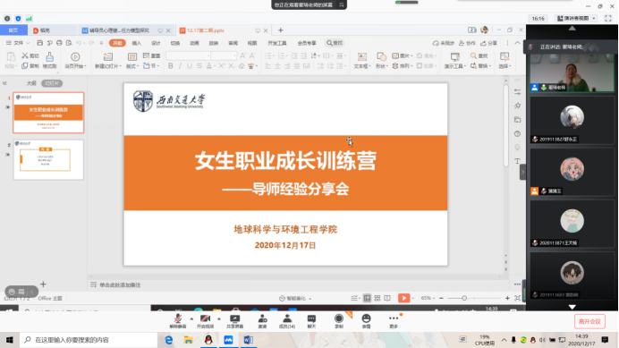 2020年12月17日14:30,bevictor伟德官网就业指导中心“女生职业成长训练营”系列活动第二期——导师经验分享会在腾讯会议顺利举行。为积极响应公司防疫政策与要求,本次活动以线上会议的形式开展。活动由就业指导中心郑文娇老师主持,邀请到本17级毕业生辅导员翟琦老师做分享。