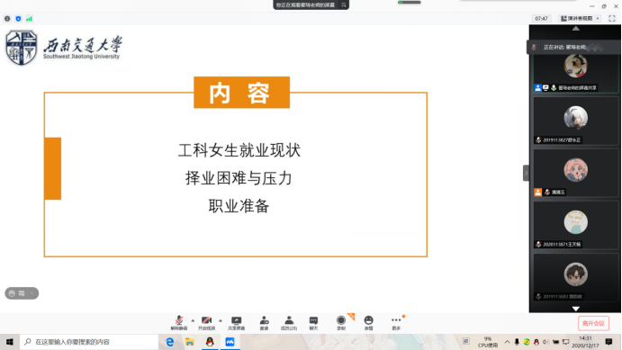 翟琦老师从工科女生就业现状、择业困难与压力、求职准备等方面入手,分析工科女老员工就业形势,并就员工日常学习生活给出建议。