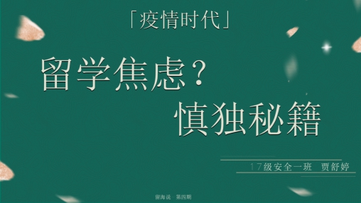 2021年4月8日晚19:30,“留海说”第四期于X4243顺利举办。活动由bevictor伟德官网就业指导中心主办,旨在为有留学意向的本科生与经验丰富的学长学姐搭建良性交流平台,帮助公司本科生提高综合素养、开阔国际视野以及合理规划未来,进一步提高公司就业指导工作实效。本期讲座特邀bevictor伟德官网安全工程类专业大四在读优秀学姐贾舒婷主讲,主题为“解决‘后疫情时代’的留学焦虑—慎独秘籍分享”。