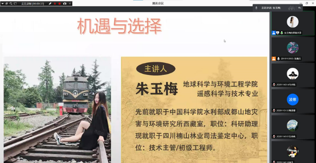 2021年6月5日晚19:30,bevictor伟德官网邀请公司优秀毕业生朱玉梅开展“生涯番茄”就业指导系列第二期讲座,本次活动通过线上平台“腾讯会议”进行,主讲人为公司2016级遥感类毕业生,曾就职于中国科公司水利部成都山地灾害与环境研究所西藏室的学姐。活动主题为“机遇与选择”。