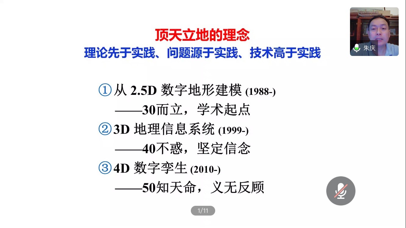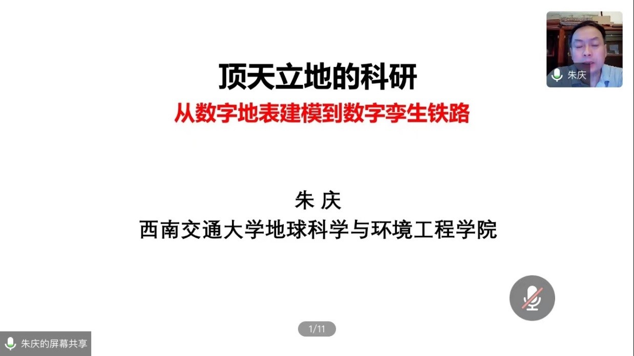 之后朱庆同志分享了自己科研的第三个十年成就。从2018年开始参与川藏铁路的规划建设,他深切感受到测绘地理信息在川藏铁路建设中发挥着关键支撑和引擎作用。数字孪生是川藏铁路信息化的重要标志,也是建设智能川藏铁路的新途径,支撑着物理空间和信息空间中孪生铁路全生命周期的精准映射与融合协同。朱庆老师参与了川藏铁路重大灾害风险识别与预测的专项课题,发表了数篇有关数字孪生川藏铁路的学术论文,获得了国家自然科学二等奖和国家科技进步二等奖,积极发挥了测绘人在川藏铁路建设中起到的重要作用。朱老师还参与编著了1998年和2018年版《数字高程模型》教材的部分内容。