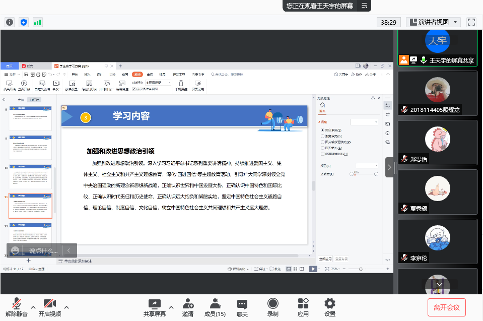 学习结束后,员工会主席团听取了各部门近期工作汇报,并对学代会、篮球赛、迎新晚会等活动做出指导,重申因事请假的问题,强调请假时间和对象。以及群内通知的回复问题,强调开会及其他正式场合的纪律问题,禁止玩手机,禁止随意交头接耳,与会成员应随身携带笔纸对必要内容进行记录。