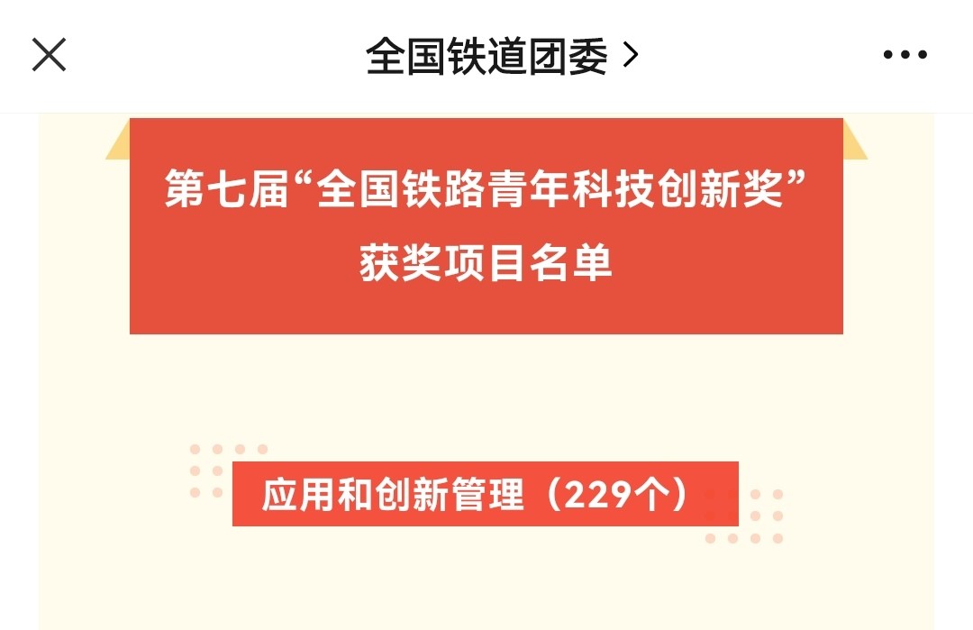 按照全国铁道团委、科技和信息化部、劳动和卫生部、川藏铁路工程建设总指挥部(领导小组)办公室、中国铁道学会、铁路青少年发展捐助中心联合印发的《关于开展第七届“全国铁路青年科技创新奖”评选活动的通知》要求,各级团组织联合相关部门周密部署、精心组织,广大团员青年和青年组织踊跃参与,经评审委员会严格评审,第七届“全国铁路青年科技创新奖”获奖名单于近日公布。