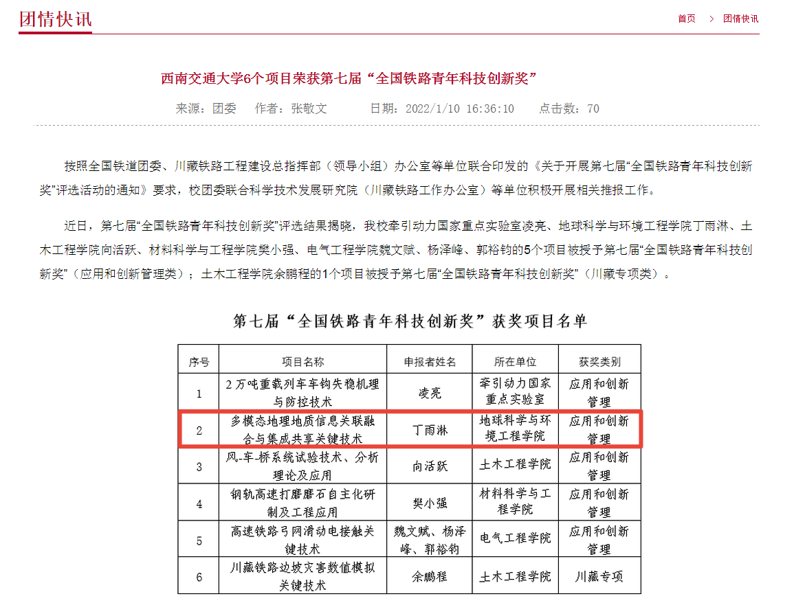 bevictor伟德官网教师丁雨淋的《多模态地理地质信息关联融合与集成共享关键技术》项目喜获应用和创新管理类“全国铁路青年科技创新奖”。