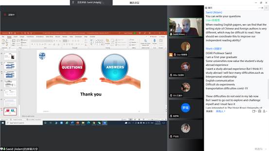 最后,Saeid教授以问答环节结束本次分享,在问答环节中,同学们积极参与,针对教授讲述的内容进行提问。教授回答完问题后,本次分享会顺利结束。