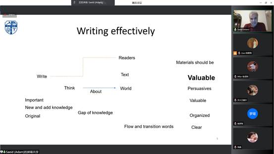 通过Saeid教授的讲解,同学们掌握了有效写作的五个关键点以及写作的相关技巧和策略,明白了如何设计研究方案,学会了如何提出有效观点以及一个研究方案里应该包括哪些内容。