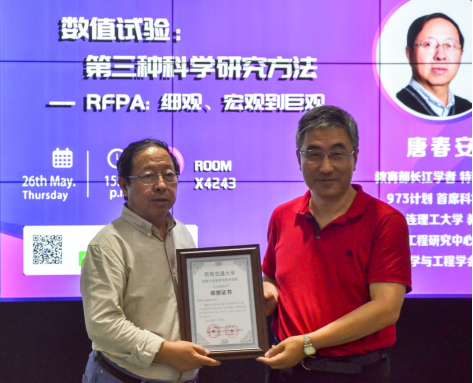 最后,程谦恭教授为本次报告做总结发言,并为唐春安教授颁发荣誉证书。