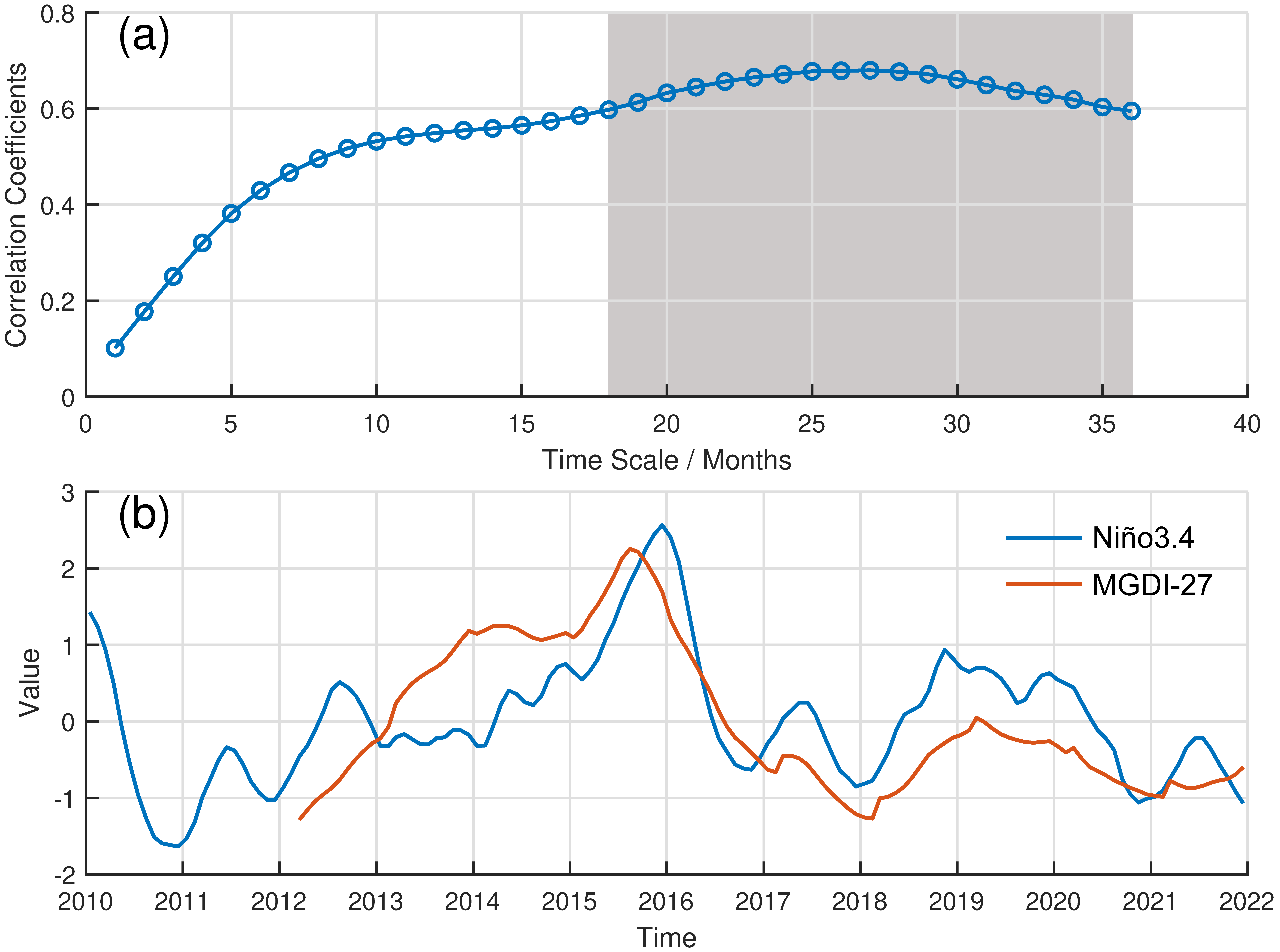 图2 (a) MGDI和Niño3.4指数随尺度变化的相关性;(b) 时变MGDI-27与Nino3.4指数的比较