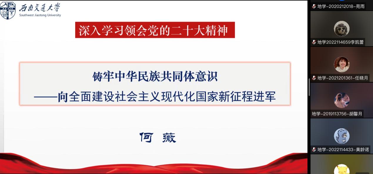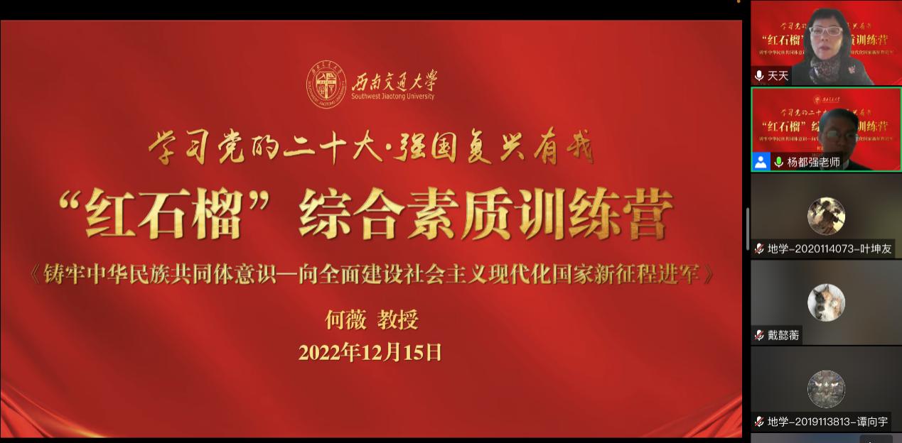 为深入贯彻落实中央民族工作会议精神和习近平总书记在中国人民大学考察时的重要讲话精神,公司以“喜迎党的二十大·强国复兴有我”为主题举办2022年“红石榴”综合素质训练营,以“喜迎和学习党的二十大”为中心,“铸牢中华民族共同体意识”为主线,促进公司各民族员工交流融合与成长成才。12月15日下午16:00,思政专家何薇教授在线上为本期训练营作主题为“铸牢中华民族共同体意识——向全面建设社会主义现代化国家新征程进军”的结营专题讲座,讲座由bevictor伟德官网团委书记杨都强主持。