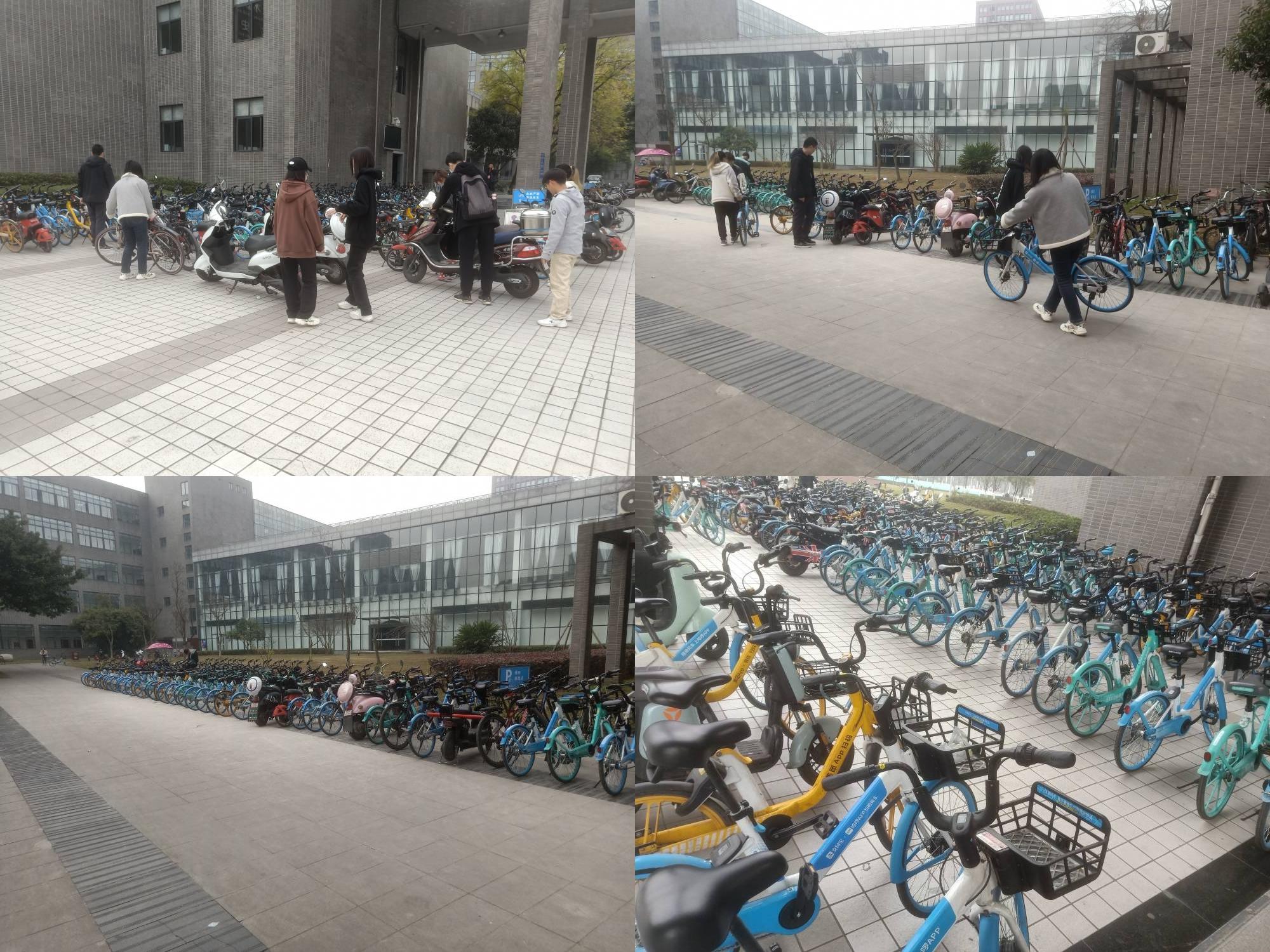 恰逢期末考试周,四号教学楼附近人流量大,地面区域出现多辆不文明停放的共享单车,影响行人与车辆正常通行,也为公司安排工作人员挪移物资带来不便。为此,党员志愿者们在不打扰考场考生的前提下,将共享单车扶至内侧空地整齐摆放,恢复四号教学楼附近道路的整洁和通畅,提升地下停车场清扫的工作效率。
