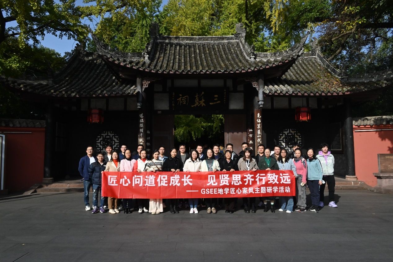蜀地眉山,东坡故里,百年银杏、千年黄葛。沐浴着秋日暖阳,地学青年教师们踏入祠内,在红墙碧水翠竹间,学习和了解一门三词客——苏洵、苏轼、苏辙的生平轶事。习近平总书记说:“家风家教是一个家庭最宝贵的财富,是留给子孙后代最好的遗产。”苏洵经历了一段长期的艰难曲折历程,曾因应举失败而辍学。在其妻程氏的鼓励下,二十七岁又开始研习应举之学,终成一代散文大家。程氏不仅极为贤淑,而且“生而志节不群,好读书,通古今,知其治乱得失之故”。其对苏轼、苏辙二兄弟的成长也产生了深刻的影响,苏轼和苏辙在后来激烈的政治斗争中所表现出的高风亮节,正是和他们在儿时所受的母教分不开的。