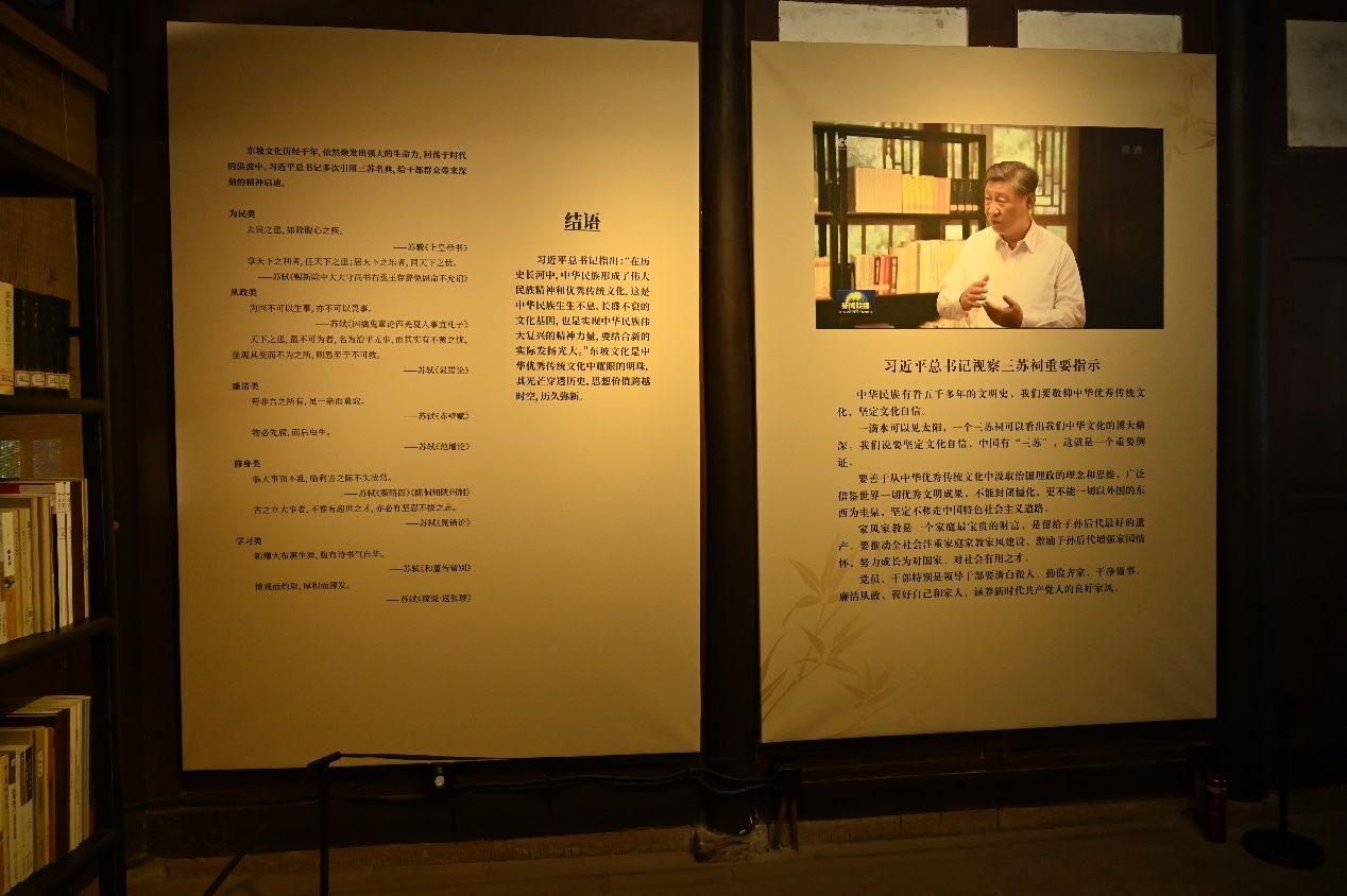 在三苏纪念馆,老师们了解了苏家三父子的生平及文学成就展。在一楼的苏洵、苏辙生平及成就展,老师们驻足“名二子说”和“出使契丹”等场景前,惊叹于苏氏父子的惊世成就;在二楼苏轼生平及成就展里,《念奴娇·赤壁怀古》、《水调歌头·明月几时有》、《卜算子·黄州定惠院寓居作》等一首首耳熟能详的诗词,勾起了老师们读书时竞相背诵的美好回忆;“苏堤春晓”、“黄州岁月”、“东坡美食”等一个个似曾相识的场景,激发了老师们对于苏东坡坚贞不屈,乐观豁达,热爱生活的热情讨论。当老师们读到苏轼“问汝平生功业,黄州惠州儋州”的自我评价时,敬佩之情却又是油然而生,不惧来时风雨,诗酒趁年华,一蓑烟雨任平生。