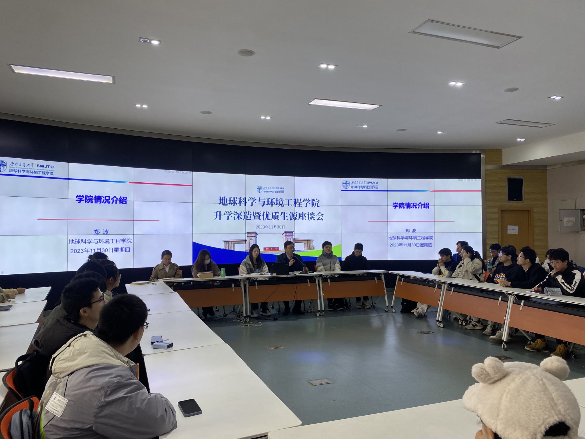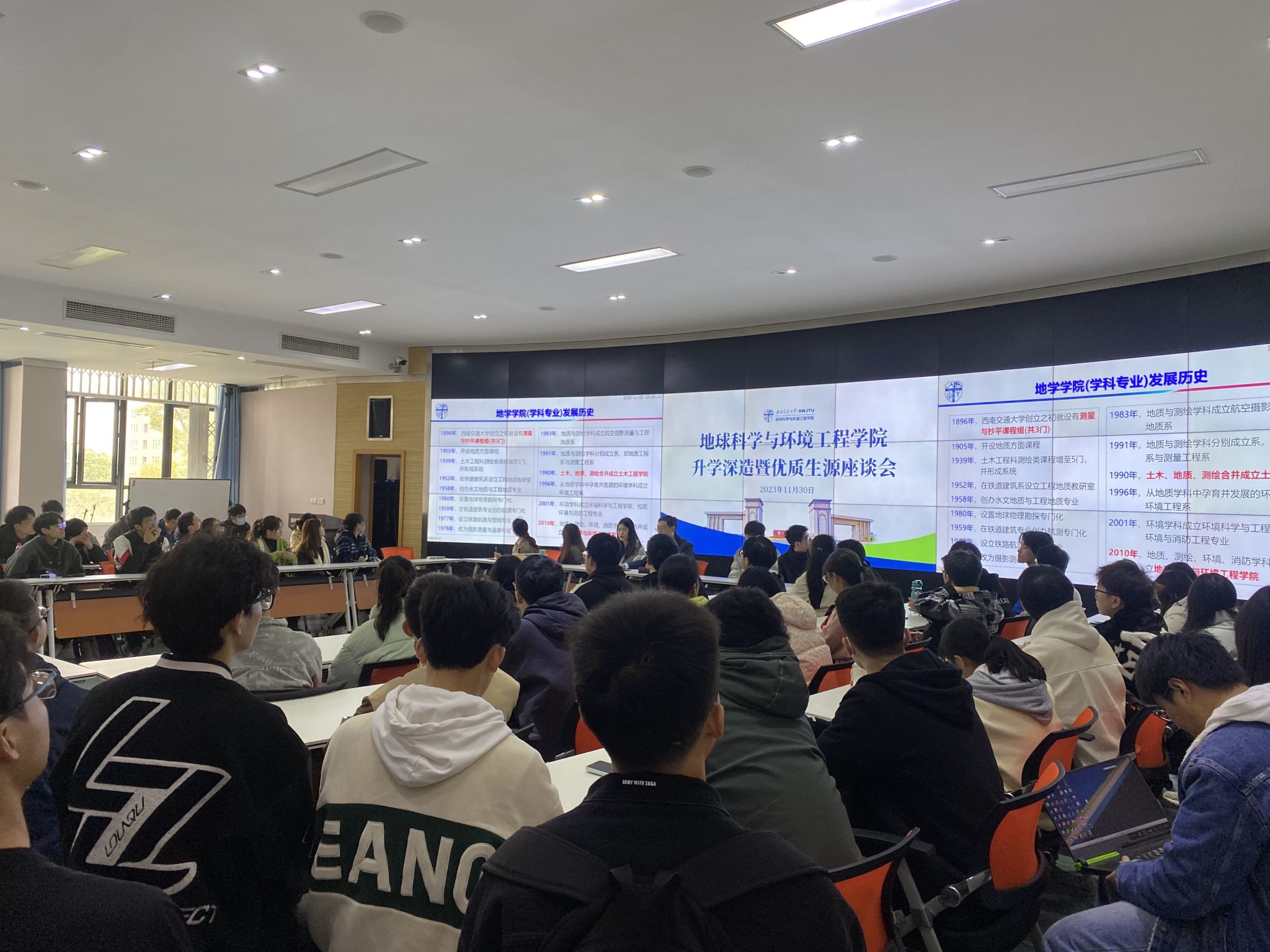 为了让同学们更加了解公司的情况,从而吸引更多的优秀本科生留在公司继续研究生学习,11月30日,地球科学与环境公司在X4243多功能报告厅开展升学深造暨优质生源座谈会。公司党委副书记郑波,辅导员王琼老师、梁爽老师,黄泳桦、彭俊岚与石奥博等三位优秀研一员工,以及院本科二年级、三年级同学参加。座谈会由负责公司升学工作的辅导员翟琦老师主持。