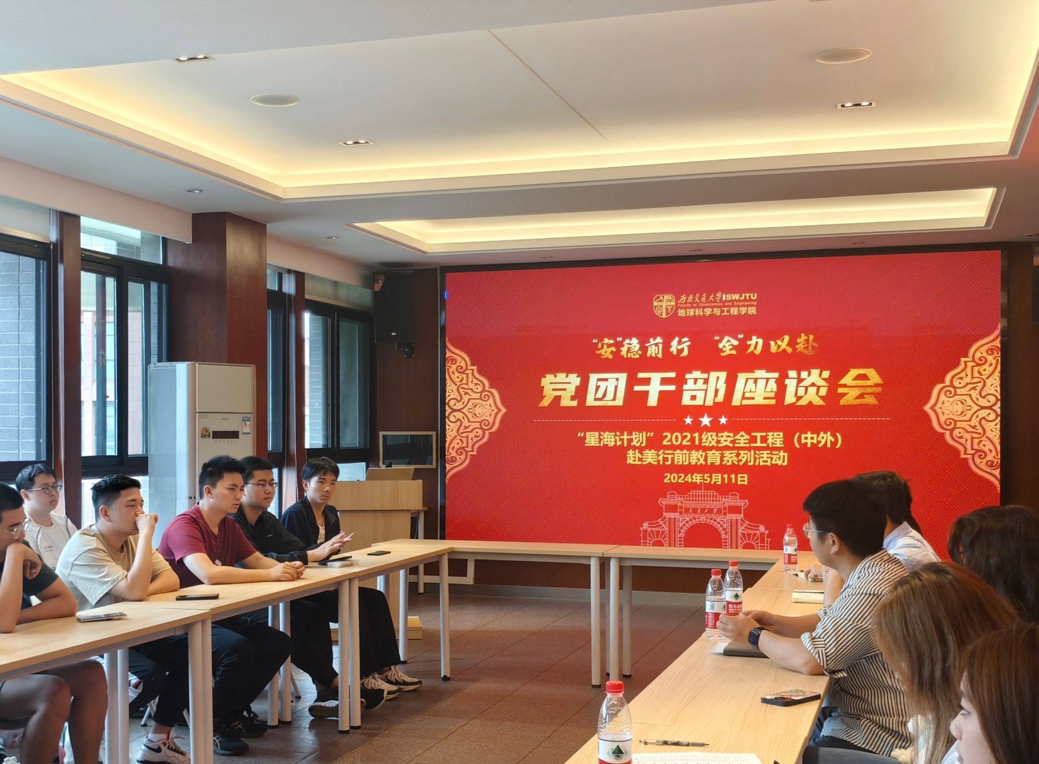 为帮助即将赴美学习的21级安工同学找准政治站位,明确使命担当,理清党团管理办法,“星海计划”2021级安全工程(中外)赴美行前教育系列活动之党团干部座谈会于2024年5月11日下午在X4520举行。地球科学与工程公司党委副书记郑波,院团委书记杨都强,员工党建工作负责人文强,辅导员梁爽及21级安全工程全体党团员工干部参加此次活动。本次活动由梁爽主持。