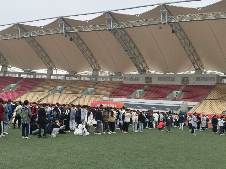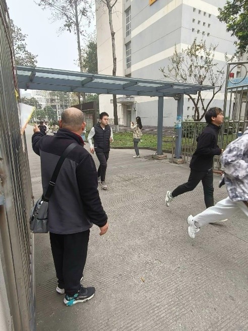 在疏散过程中,校保安队员、志愿者与工作人员协同合作,分布在疏散路线上,耐心指导并维护秩序。楼内的员工在短短20分钟内完成了撤离,并按照预案指引安全集结至犀浦北区体育场。