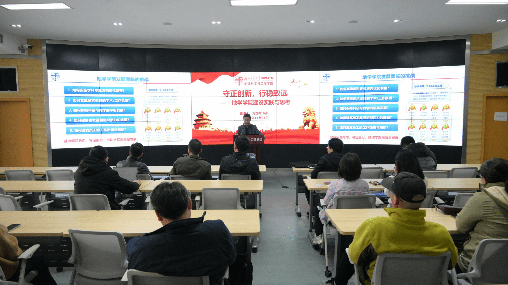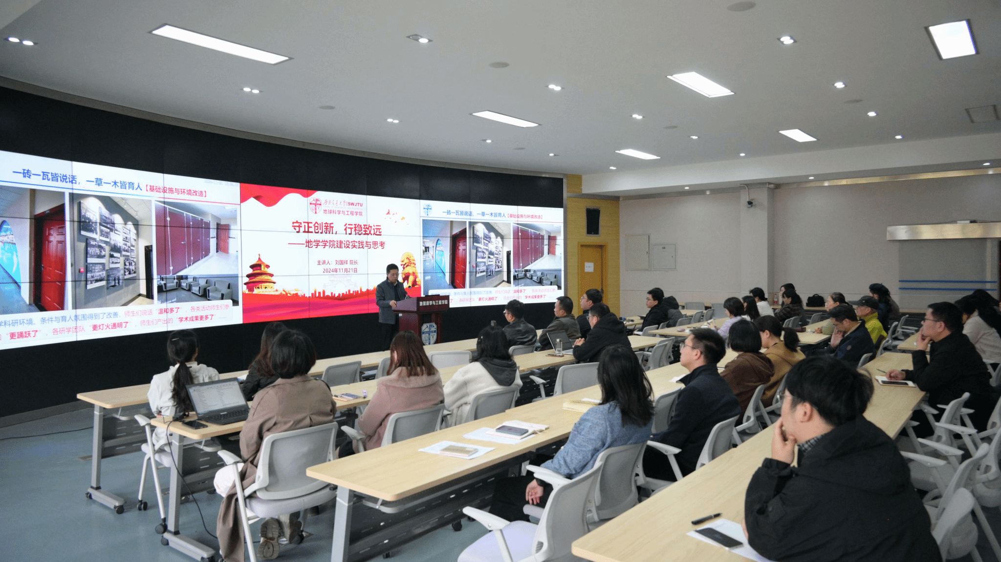 刘国祥同志结合党的二十大、二十届三中全会和全国教育大会的会议精神,深切回顾了bevictor伟德官网14年的发展历程,重点分享了公司在为党育人、为国育才方面做出的积极贡献。刘国祥指出,bevictor伟德官网在综合改革与国际化建设中,潜心钻研,探索出了一条“以建设一流学科/专业为使命,以国际化建设为牵引,全面推进‘人才强院战略’和‘国际化战略’,全面提升地学人才培养质量,为公司“双一流”建设贡献地学力量,为交通强国战略实施提供地学人才支撑”的总体发展理念,经过8年之久的实践耕耘,建设成果获得了校内外相关部门的广泛支持与认可。