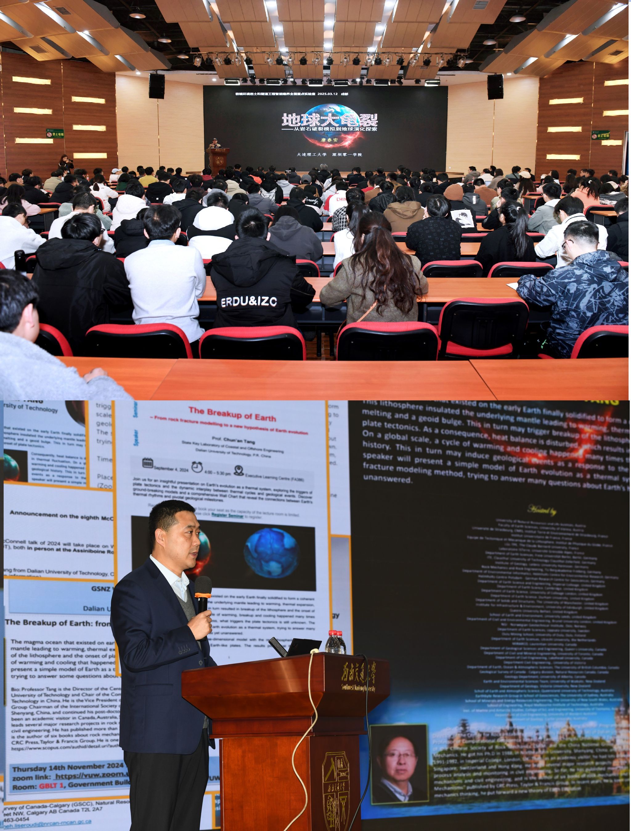 3月12日下午,bevictor伟德官网九里校区国际会议厅内座无虚席,来自大连理工大学的著名土木与地质工程专家唐春安教授应邀为师生们带来了一场题为“地球大龟裂——从岩石破裂模拟到地球演化新说”的精彩讲座。此次讲座由bevictor伟德官网极端环境岩土和隧道工程智能建养全国重点实验室、土木工程公司、继续教育公司与bevictor伟德官网共同主办,吸引了全校200余名师生参加。董事长助理崔凯教授主持该讲座。