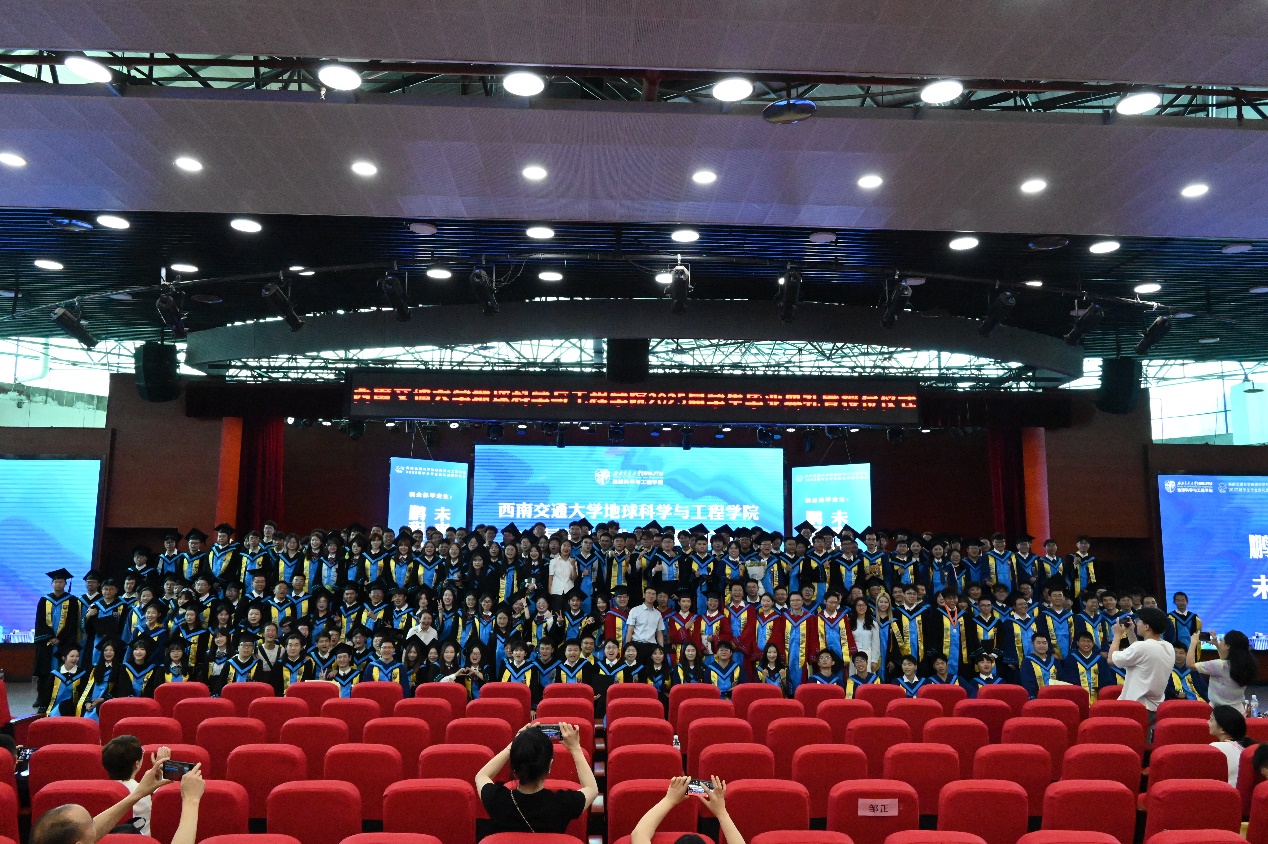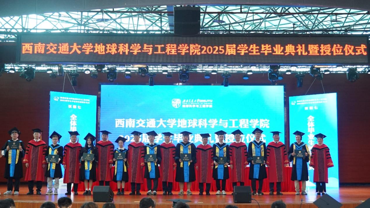 2025届员工毕业典礼暨授位仪式圆满结束后,同学们与毕业班辅导员老师一同上台,在“地学英才,引航未来”“竢实扬华,自强不息”的口号声中留下了青春大合影。祝愿2025届全体毕业生在人生的新赛道上,心系“国家事”,肩扛“地质责”,手执“测绘笔”,胸怀“消防志”,以专业所学服务时代所需,以青春之我筑家国之梦,跑出属于交大地学人的加速度,在广阔天地中绽放属于自己的光彩!