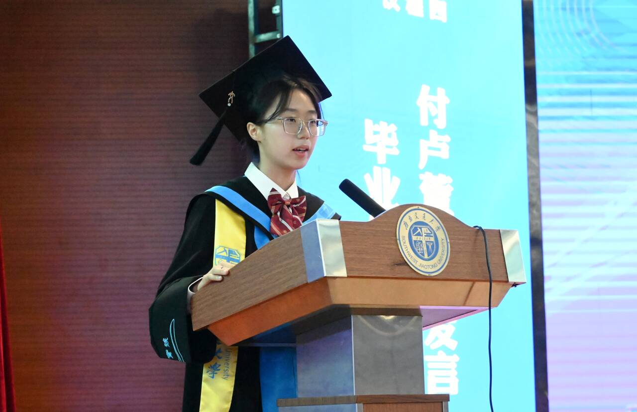 2021级测绘茅班付卢萱作为员工代表发言。她分享了个人在交大地学的成长历程与感悟。作为即将开启新征程的毕业生,付卢萱同学表示,毕业不是终点,而是站在更高处瞭望世界的起点。她号召同学们永葆“敢挽桑弓射玉衡”的锐意,带着“脚踏实地,丈量山河”的初心奔赴山海,在各自所在的领域写下属于地学英才的时代答案。