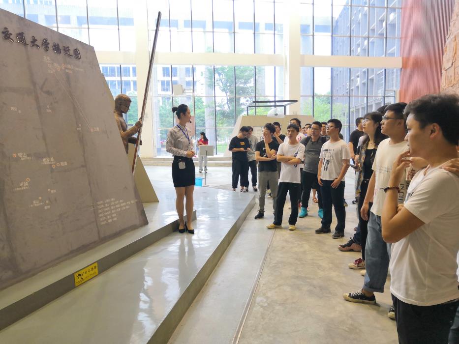 在孙惠敏老师的带领下,全体成员陆续进入校史馆。步入校史馆映入眼帘的是一辆具有轨道交通特色的绿色火车头,在校史馆讲解员郭梦岩同学的讲述下,交大的历史华章向我们逐步展现。