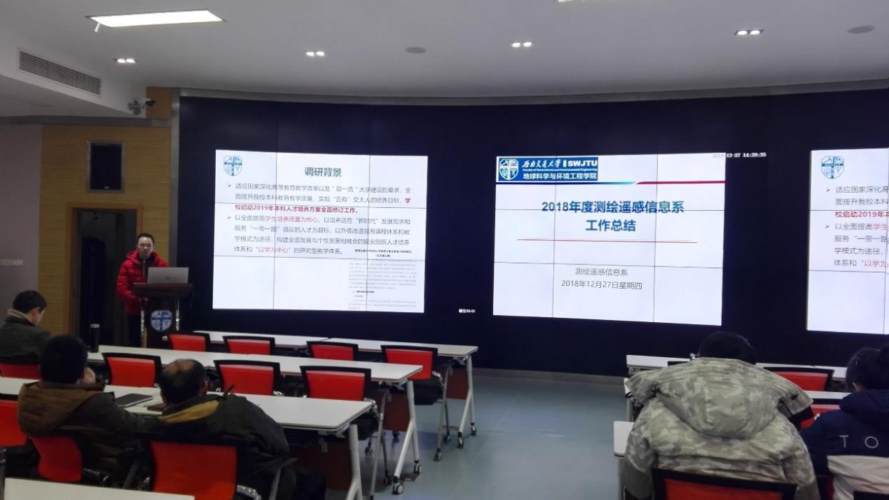 2018.12.27下午2点30分,测绘遥感信息系在X4243召开了2018年度总结大会。首先,系主任朱军教授对2018年度测绘遥感信息系工作进行了总结汇报,他对系班子成员分工、财务收支情况、引进人才情况、考核评优、本科教学事务、研究生教育、科研管理、团队建设、资产、实验室及实验教学事务等方面进行了详细介绍。朱军教授总结到2018年测绘系取得了令人瞩目的成绩,老师们把测绘系当作一个大家庭,共同进步,希望老师们再接再厉,共同推动测绘学科的发展。然后,系主任助理游为副教授介绍了测绘系赴武汉大学测绘公司和西安科技大学测绘科学与技术公司调研的情况,张献州教授进行了补充说明。最后,朱军教授对新进的王化光副教授和尹高飞副教授进行了介绍。至此,测绘系2018年度总结大会圆满结束。