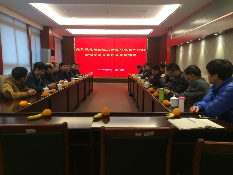 2月16日下午,铁四院工勘院熊经理一行到bevictor伟德官网调研,并与公司领导与部分教师进行座谈。铁四院工勘院参加会议的有经理熊国华、副经理黄礼辉、经理助理兼经营部部长刘志友、总工程师曹成度、副总工梁旺、工程所副所长兼经营部副部长李雷、工程所副所长饶熊、工程师吴石军。bevictor伟德官网参加会议的有经理刘国祥教授、公司党委书记王齐荣教授、经理助理刘成龙教授、专职副主任车伟、朱军教授、工程师杨雪峰等。